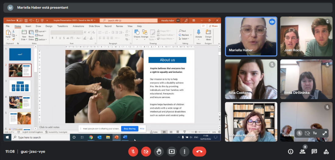 On 2 March 2022, all project partners attended the kick-off meeting via an online videocall, Mariella Haber HR (Human Resources) Consultant represented the Inspire Foundation. This meeting provided the project participants with the opportunity to present their Organisation and service towards people with a disability and their activities in the field of social inclusion for young people with disabilities. The consortium agreed on a joint training program for their employees to further networking and cooperation activities between themselves to be held in Tarrega, Spain between 6 – 10 June.