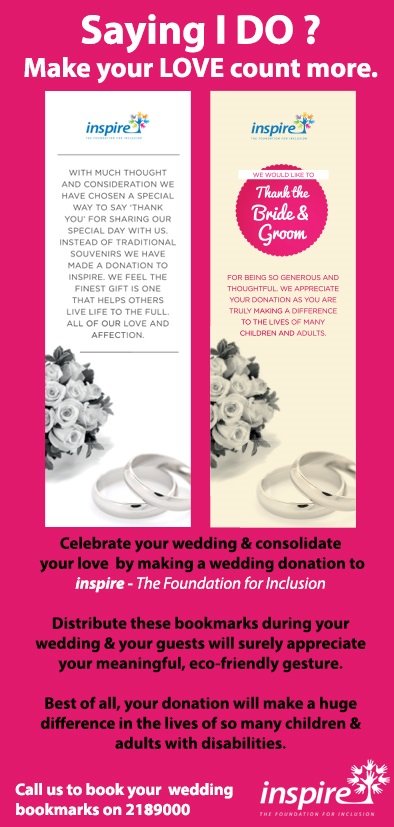 Inspire – The Foundation for Inclusion which offers therapeutic, education and leisure services to many persons with disabilities, facilitates this good gesture by providing couples with wedding thank you cards to distribute to guests.